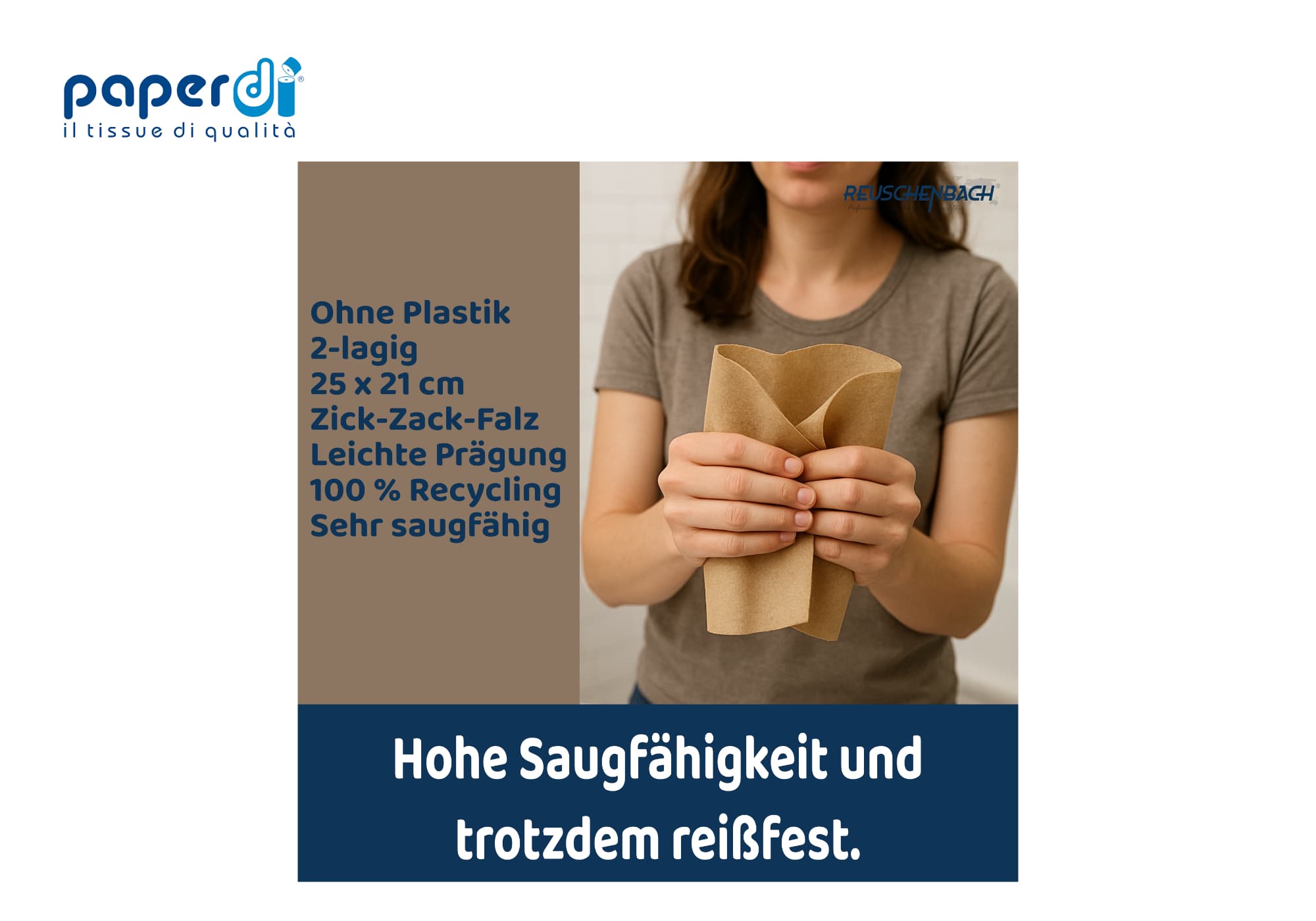 Mit einer Grammatur von 18,5 g/m² sind die Paperdi Handtücher außergewöhnlich stabil – selbst im nassen Zustand. Perfekt für tägliche Nutzung in Bereichen mit hohem Besucheraufkommen.